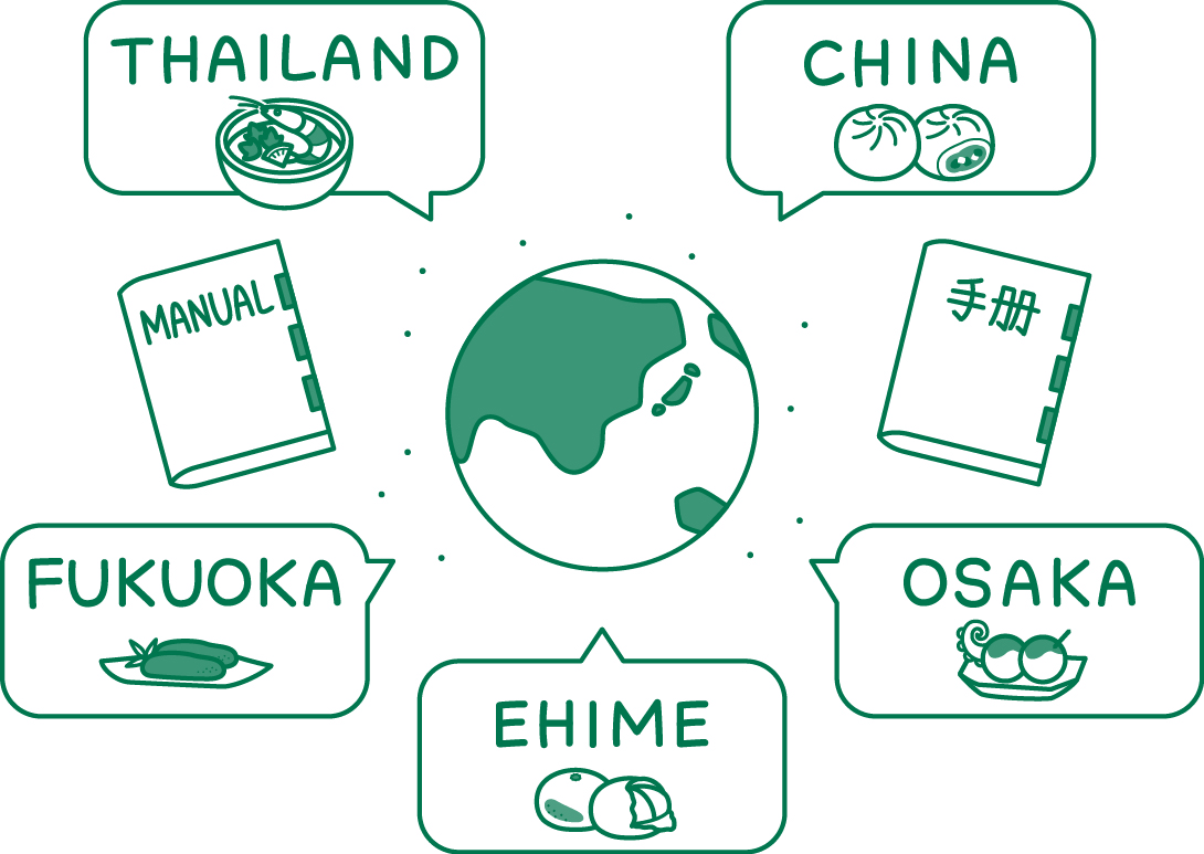 国内3拠点(大阪、愛媛、福岡)と、中国・タイの海外拠点で、制作内容に応じたチーム編成を構成して対応します。海外向けは翻訳コーディネートから対応。30言語以上の制作実績があり、現地への校正確認もサポート可能です。