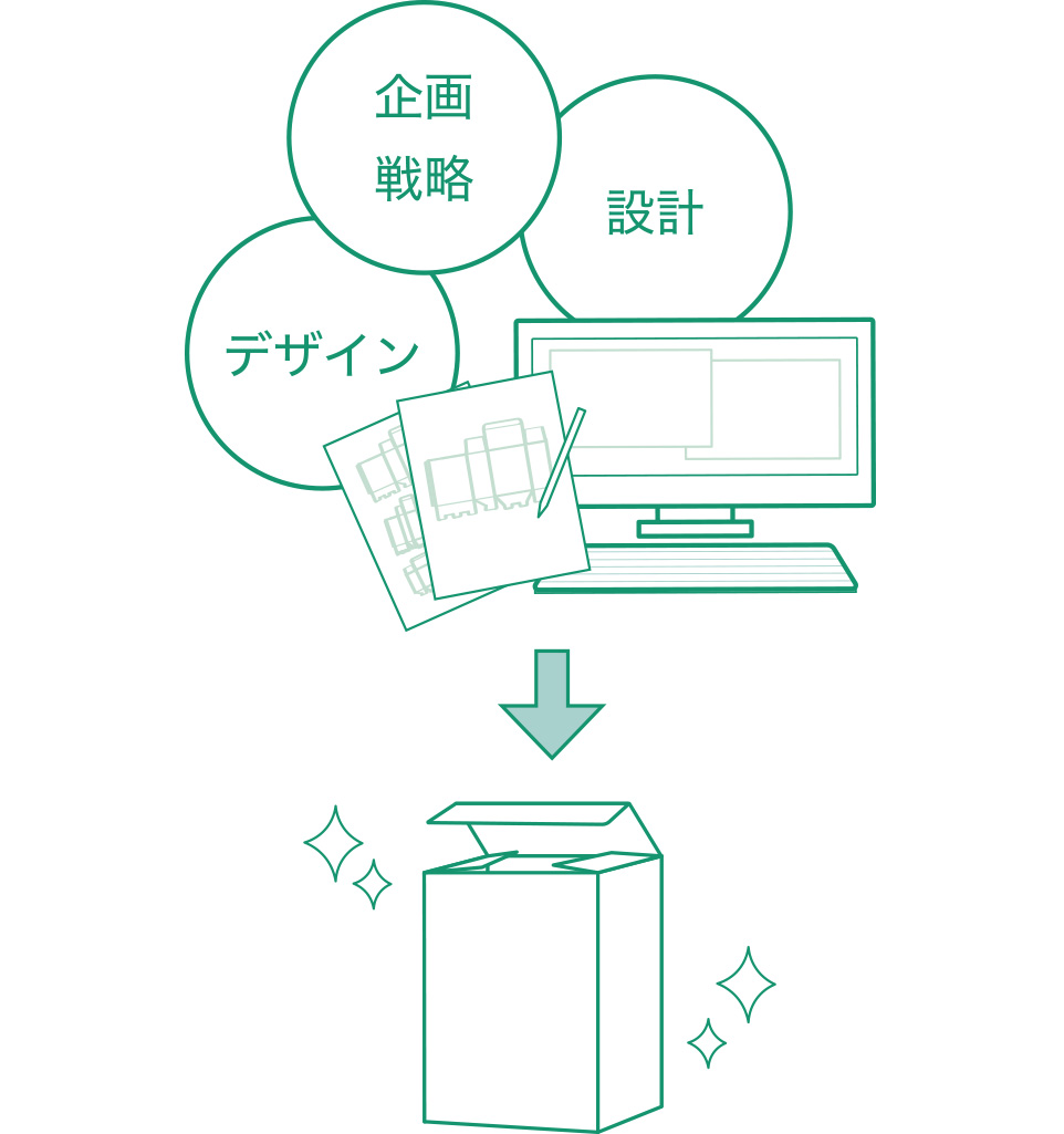 商品に込められた想いを、より多くの人に伝えるお手伝いをするため、パッケージの企画から設計、デザインまでトータルな販売戦略をご提案します。