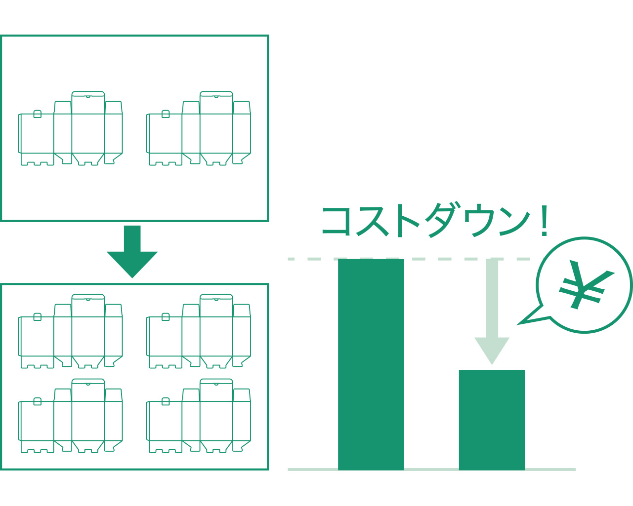 適正な用紙の厚みやサイズ、割付を検討することで、無駄を省きコストの最適化が図れます。例えば、商品に対してオーバースペックな紙厚や、余白の多い紙取りを見直すことで用紙価格を抑えることができます。また、組立てれば同じ形状であってもパーツ数を少なくする設計をすることで木型、用紙のコストダウンにつなげることができます。