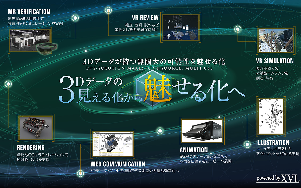 真生印刷はグループ会社と連携し、軽量で展開性の高い3Dデータを扱った3D活用を得意としています。ひとつのデータからさまざまな媒体へアウトプットすることで、お客様のご負担を軽減し、事業を変革するものづくりをご提案します。