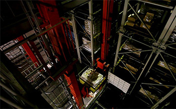自動ラックの大容量立体倉庫内で製品を保管します。パレットは取扱説明書やパッケージなどの紙製品、バケットはラベルやレンズ部品など小物類の収納に使用します。