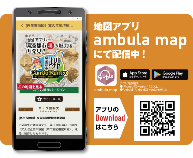 「再生古地図」で「環濠都市・堺」が現代に蘇ります。さらに自転車等でご利用いただける、広域マップをご用意いたしました。「堺“まち巡り”地図アプリ」で楽しみながら体験してください。